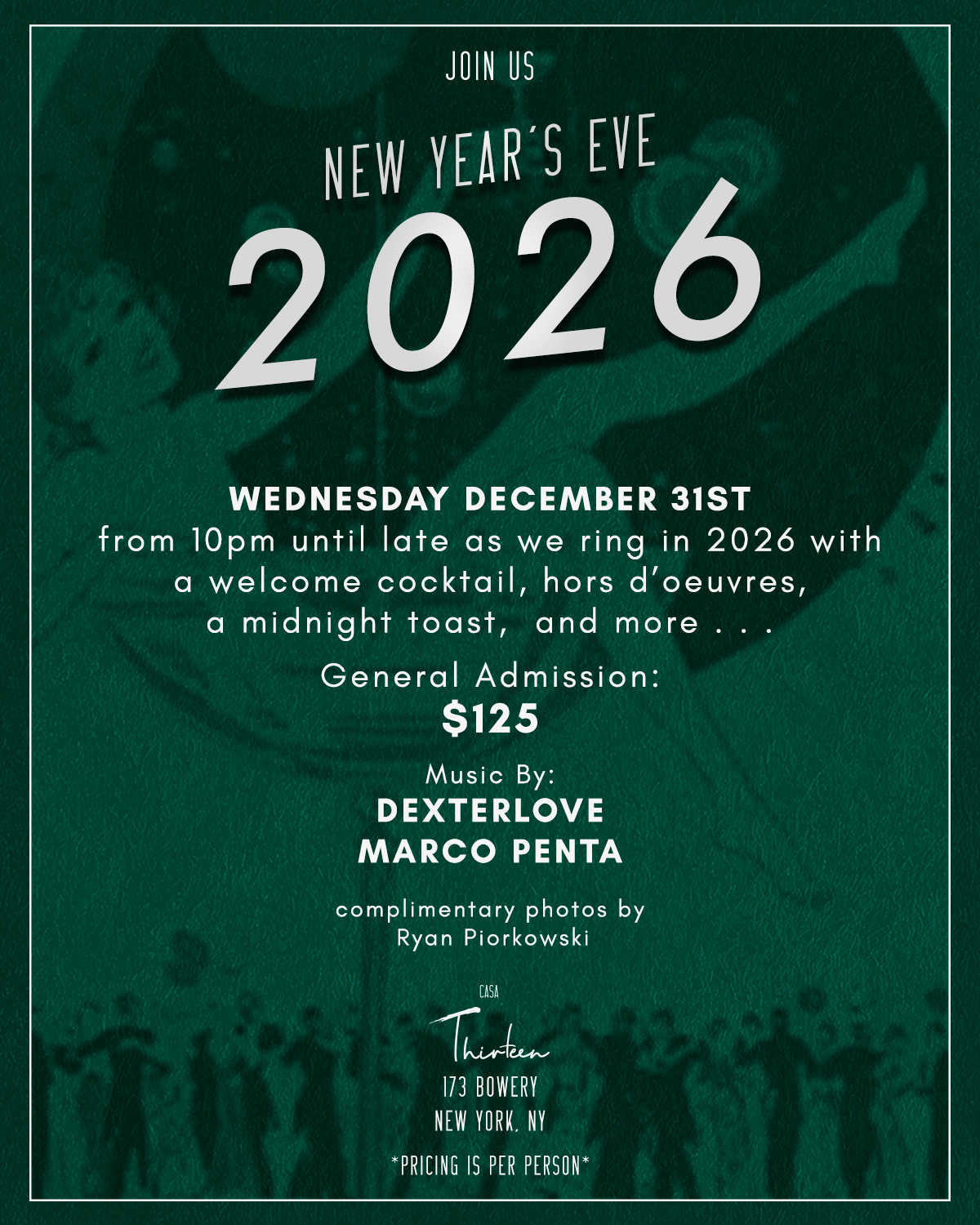 Celebrate the New Year with us and join us on New Year's Eve! From 10pm until late as we ring in 2026 with a welcome cocktail, hors d'oeuvres, a midnight toast, and more...